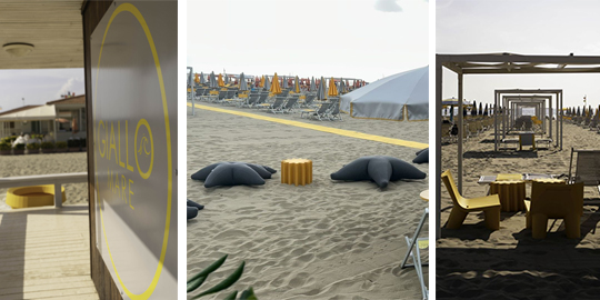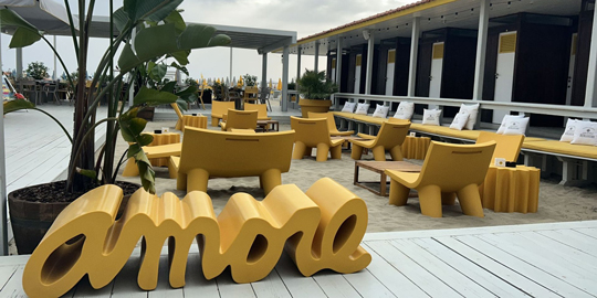 Viareggio is one of the most popular seaside resorts in Italy. Our client Giallo Food and Drink has equipped its establishment with an all-yellow look. Gear coffee table, Low Lita and Low Lita Love lounge chairs and Amore bench find their perfect space directly on the beach, to give a colourful and playful touch to Gialloìs guests holidays.