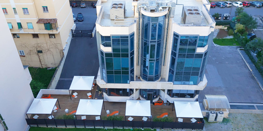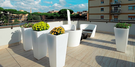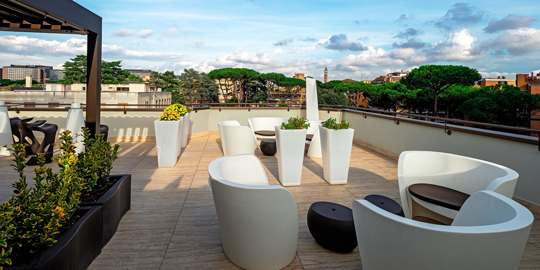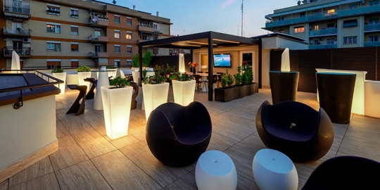 In Rome, EUR Caravaggio, at the headquarters of Sermetra Holding Group, Finmos S.r.l. created a unique rooftop divided into two different areas: one for representative events with the company's stakeholder and one for the employees. The first one is composed by different areas with different functions: the meeting area with Hoplà tables, Gloria chairs and Privè vases; the bar area with Break Bar counters, Pint and Peak tables and Konkord stools; and relaxation areas with Blos collection. Luminous X-Pot planters and the Manhattan lamp have also been included, making the ambience in the evening events truly captivating and pleasant.