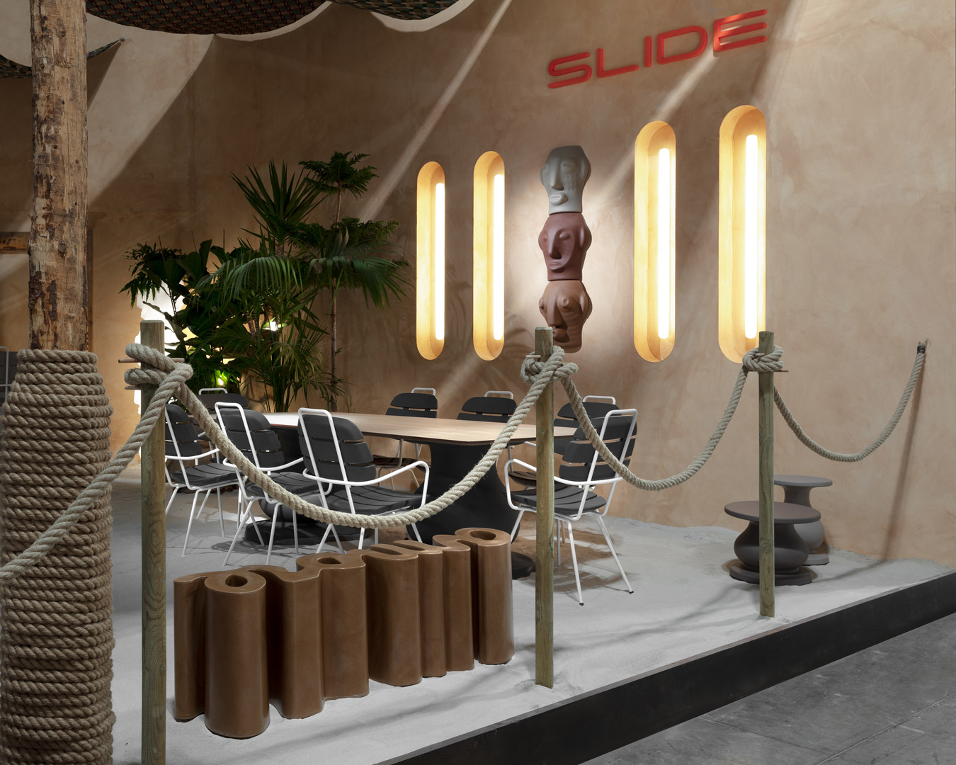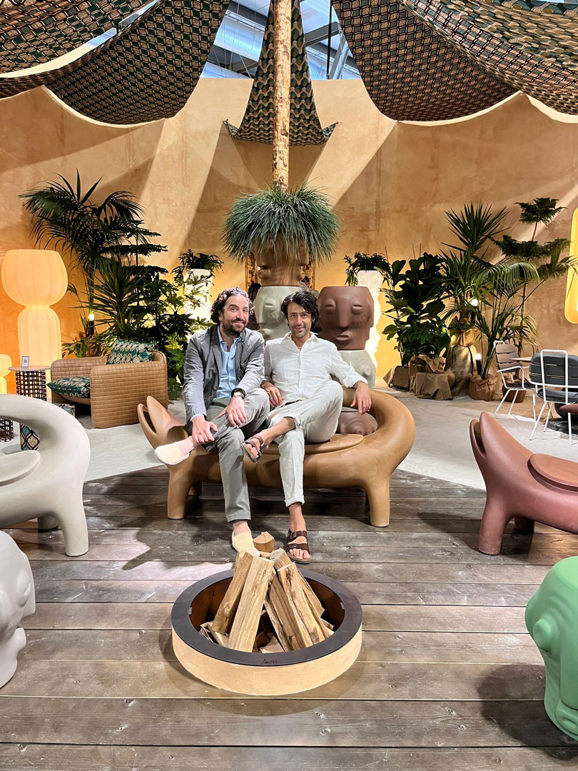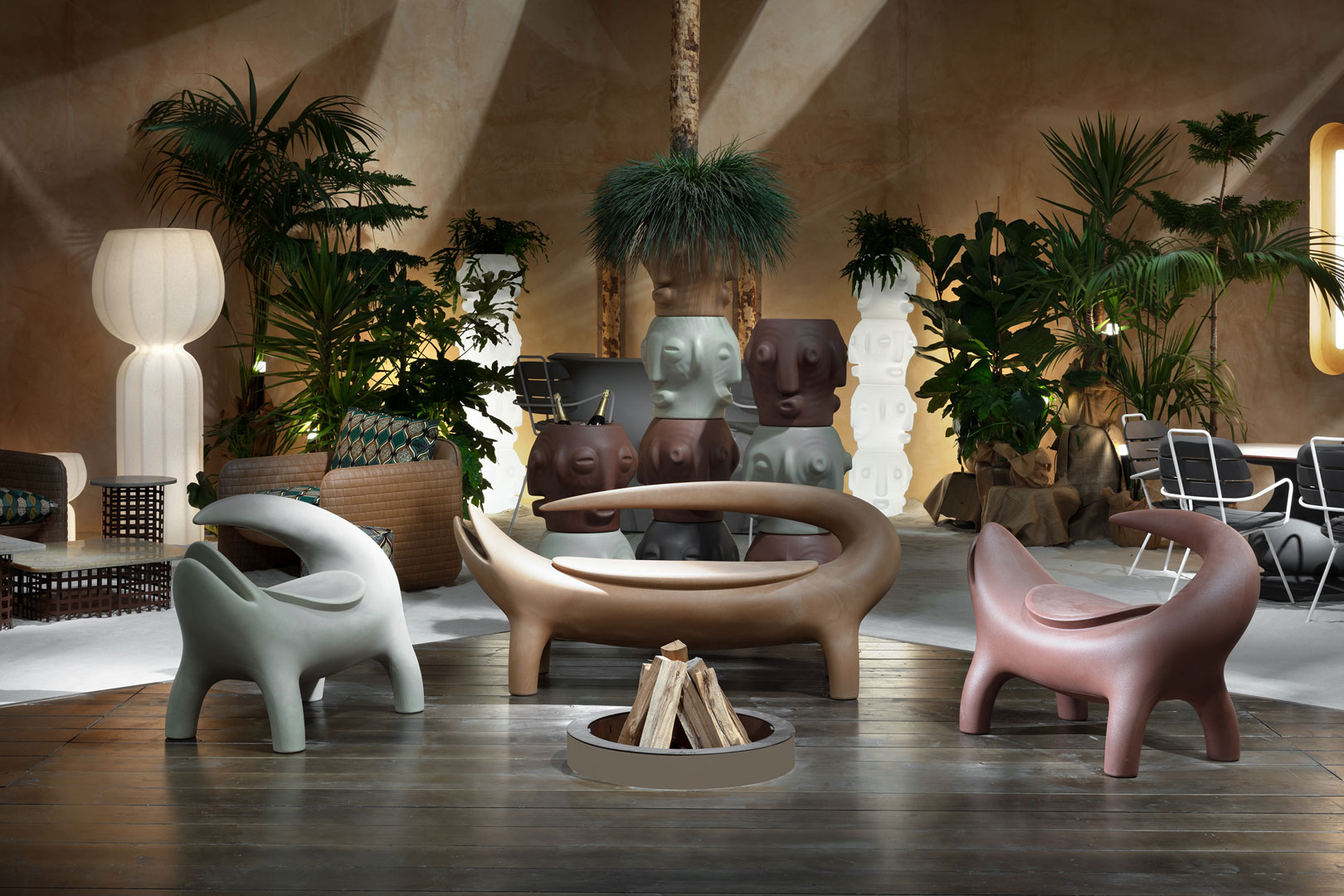 La deuxième innovation majeure introduite est le nouveau matériau bioplastique issu de la canne à sucre. Toute la collection Afrika et la collection Mara Masai ont été présentées avec cette matière particulière, qui rappelle les couleurs de la terre et nous relie à la taille. Une exclusivité dans le secteur du design, grâce à notre département Recherche et Développement, nous sommes les premiers à introduire ce matériau pour la création de mobilier d'extérieur.