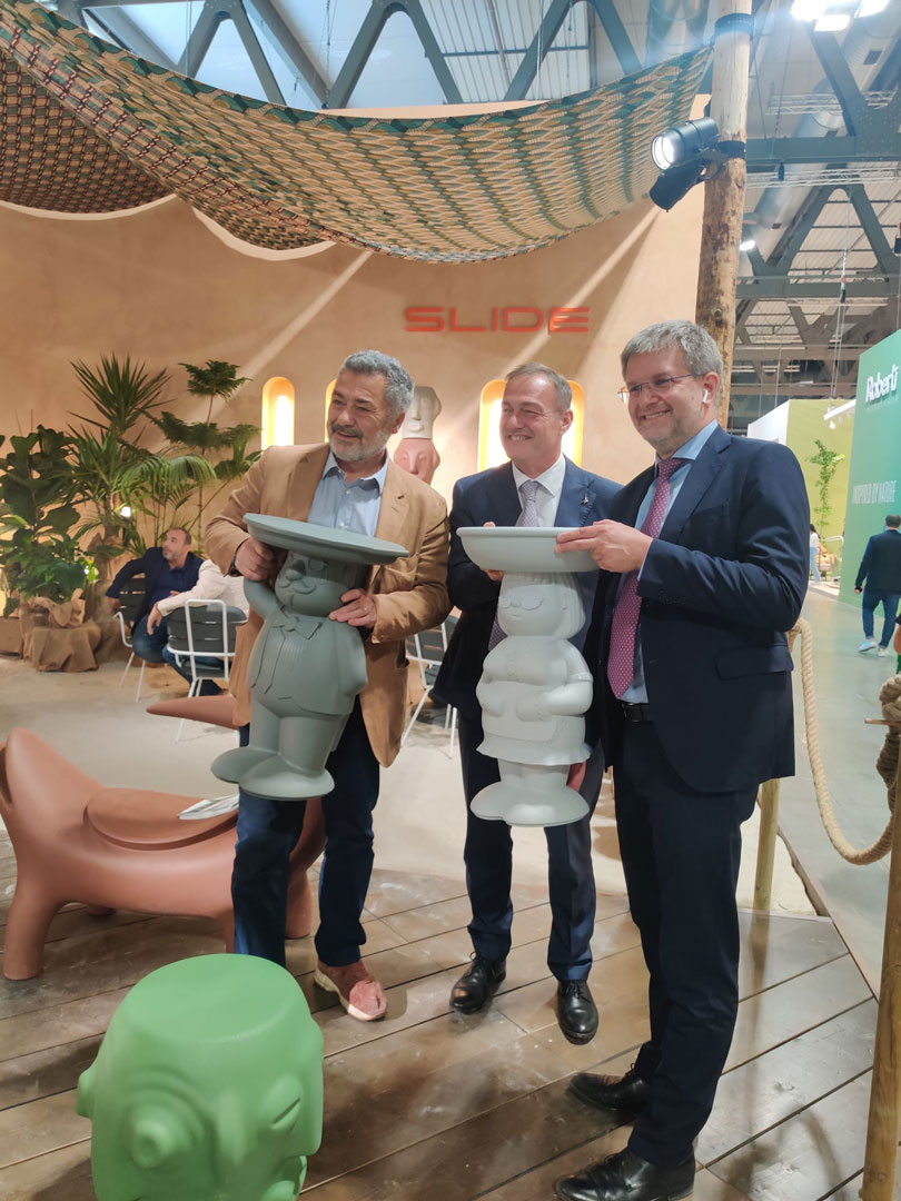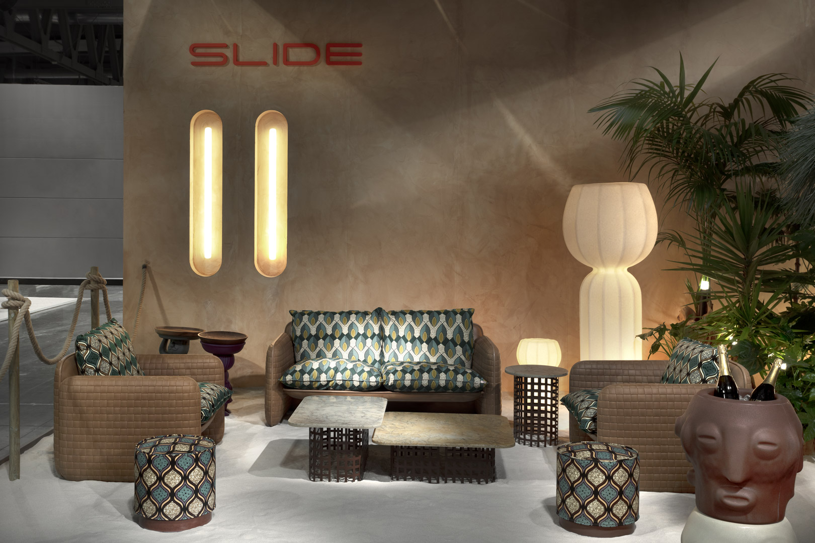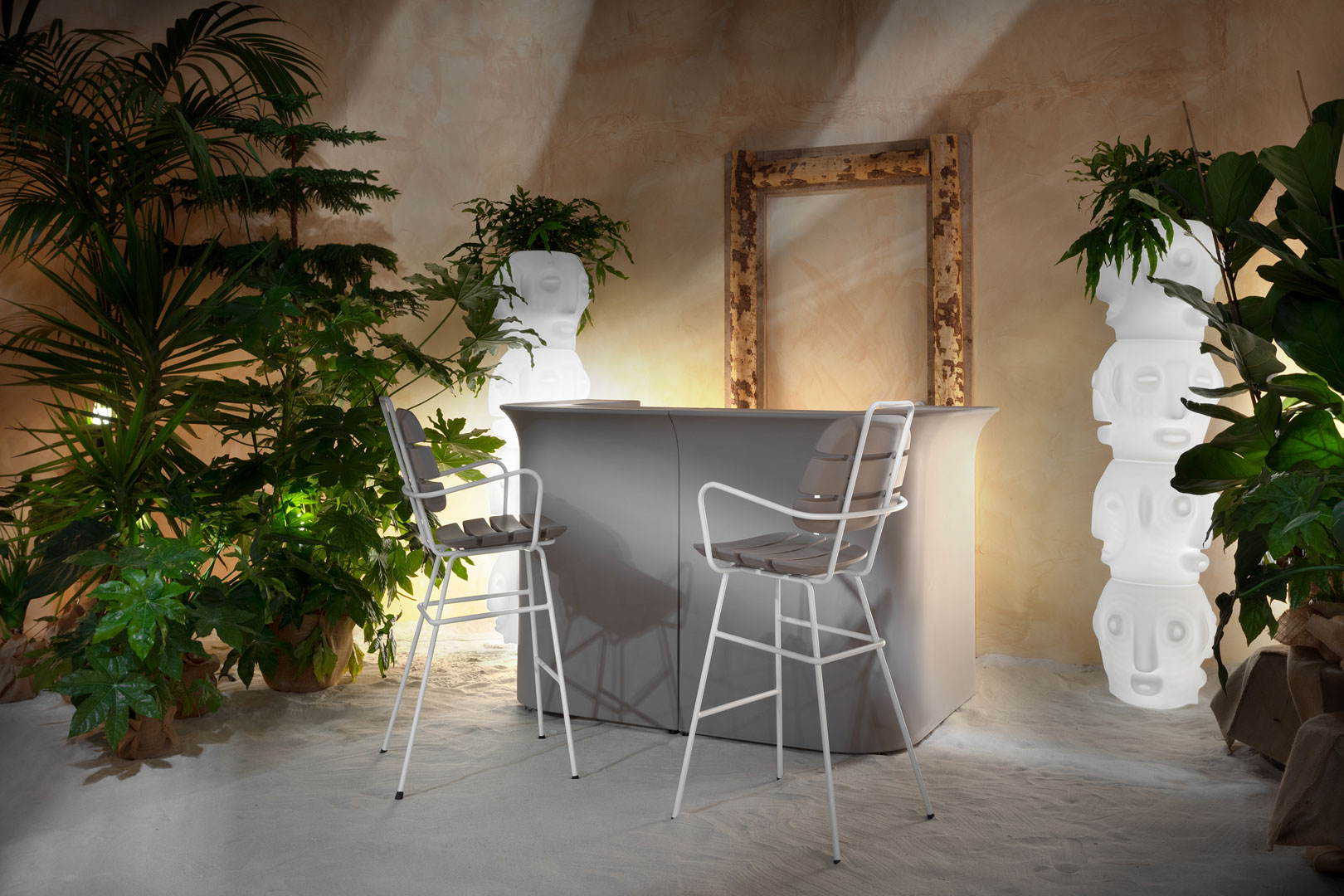 La deuxième innovation majeure introduite est le nouveau matériau bioplastique issu de la canne à sucre. Toute la collection Afrika et la collection Mara Masai ont été présentées avec cette matière particulière, qui rappelle les couleurs de la terre et nous relie à la taille. Une exclusivité dans le secteur du design, grâce à notre département Recherche et Développement, nous sommes les premiers à introduire ce matériau pour la création de mobilier d'extérieur.
