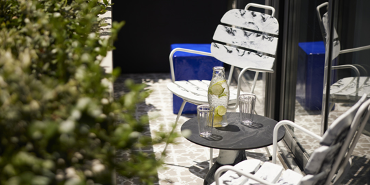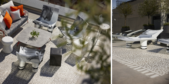 Del progetto fanno parte la collezione Low Lita, i tavolini Ottocento Mini e le sedie Ribs nella nuance black&white, che rende ogni pezzo unico e non ripetibile.