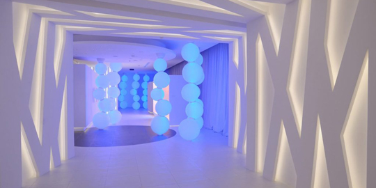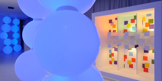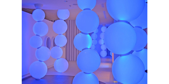 Il progetto vede, nella sua parte centrale, l'utilizzo delle nostre intramontabili Globo, personalizzate e customizzate per costruire delle colonne luminose di forte impatto scenografico.