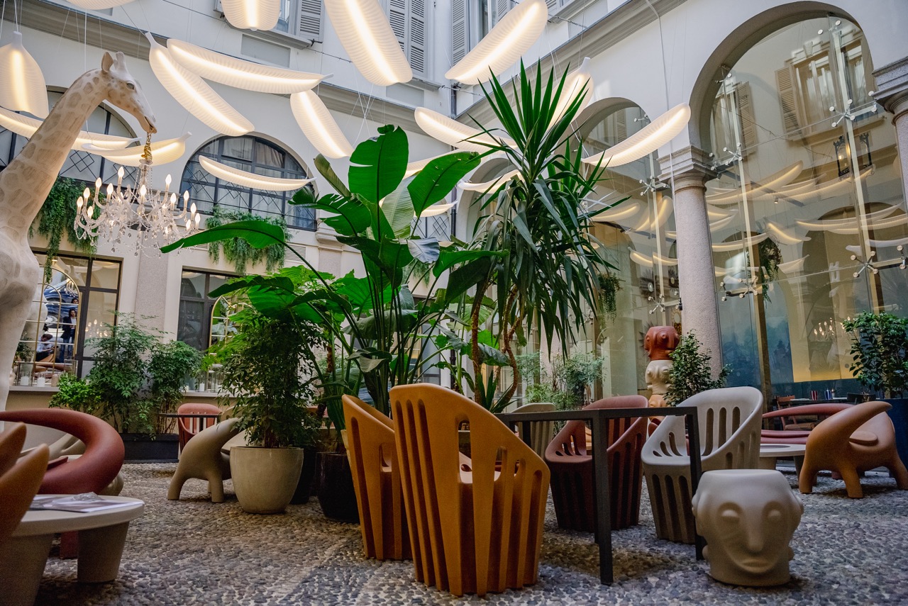 L’installazione, così come l’iconica collezione Afrika, è progettata da Marcantonio, noto designer che da tempo collabora con SLIDE. Il progetto parte dalla facciata dell’hotel, che è stata illuminata da diversi pezzi di Banana Leaf con un’installazione scenografica e di forte impatto visivo, e prosegue all’interno nella hall, nella lounge e nel cortile interno anche con altri pezzi della collezione Afrika come Kroko e Threebù. Hotel Indigo Milan, di Planetaria Hotels e parte di InterContinental Group, è un boutique hotel che sorge in un prestigioso palazzo di inizio Ottocento nel centro storico di Milano ed è caratterizzato da un chiostro colonnato e un cortile interno su cui si affacciano alcune delle cinquantuno camere di cui è composto. Il luogo ideale per sottolineare come design e hospitality siano due mondi sempre più connessi e complementari sia per i progettisti, chiamati a progettare ambienti non solo funzionali ma anche belli ed empatici, sia per il pubblico finale che non cerca solo servizi di alta qualità ma anche esperienze emotive e sensoriali.