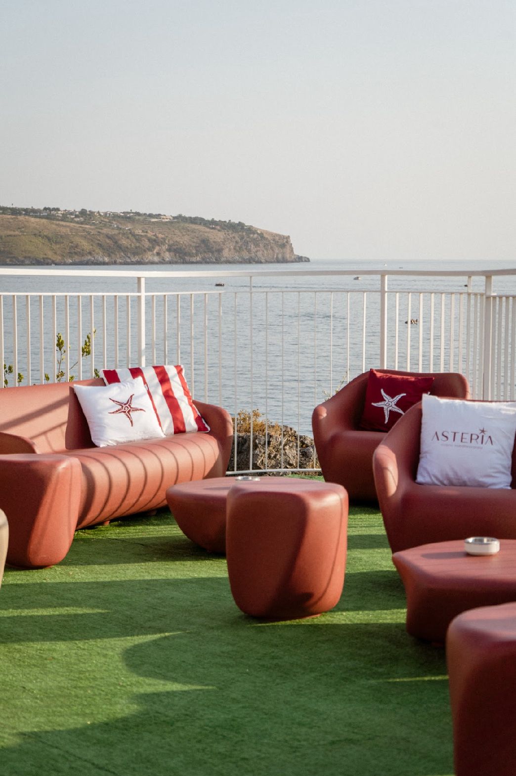 Per la grande terrazza sul mare, ASTERIA ha scelto la collezione Reborn, disegnata da ecoBirdy per SLIDE: una famiglia di arredi realizzati interamente in plastica riciclata, dove sostenibilità e design dialogano con colori intensi e una matericità unica. Qui, le poltrone, i divani e i tavolini prendono vita in due nuance iconiche, Hibiscus Red e Almond Beige, selezionate per rispecchiare la palette del club e amplificarne il carattere visivo. I toni caldi e vellutati di Reborn dialogano con la luce del tramonto, con il blu profondo del mare e con le essenze vegetali mediterranee che incorniciano lo spazio.