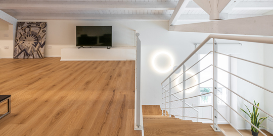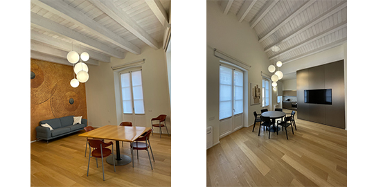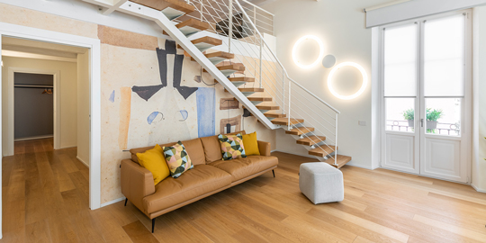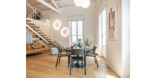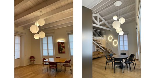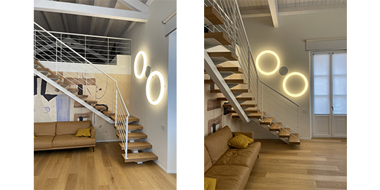 Grazie alla ristrutturazione 2021, per uno dei sei appartamenti sono state scelte le nostre lampade. Una composizione di Globo Hanging illumina la zona pranzo sopra il tavolo, mentre per la scala sono stati scelti i Giotto Wall di Roberto Paoli.