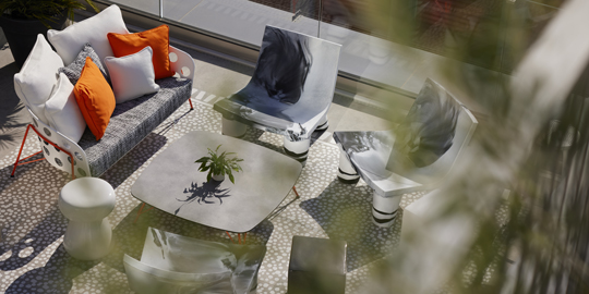Del progetto fanno parte la collezione Low Lita, i tavolini Ottocento Mini e le sedie Ribs nella nuance black&white, che rende ogni pezzo unico e non ripetibile.