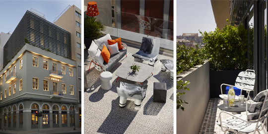 Unendo l'edificio modernista originario con la struttura neoclassica vicina, l'hotel si apre su uno dei viali più storici della città e dispone di un nuovissimo ristorante, una terrazza sul tetto e 15 camere aggiuntive, molte delle quali con vista sull'Acropoli. Combinando elementi di design contemporanei, storici e folcloristici, la struttura è stata trasformata in un microcosmo della città; un luogo dove il vecchio incontra il nuovo, dove le contraddizioni sono punti di celebrazione.