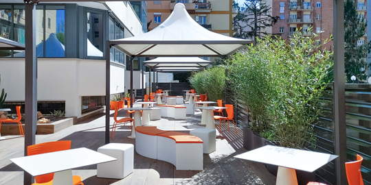 Inoltre, è stato realizzato anche uno spazio per i dipendenti della struttura. Sono stati creati diversi Dehors attrezzati con i tavoli Hoplà e le sedie Gloria e delle zone relax utilizzando i modelli Snake, Soft, Wave e delle fioriere Privè.