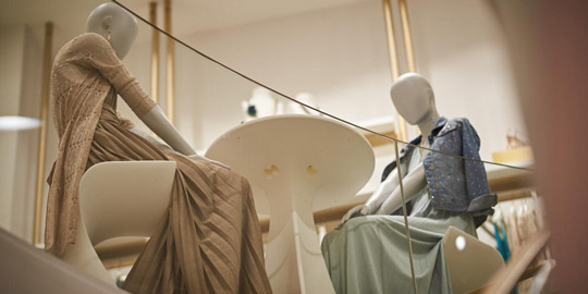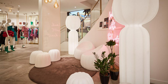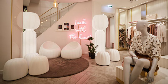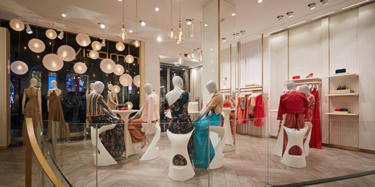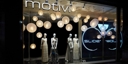 L'allestimento Motivi è nato grazie all'unione tra due brand freschi, giovanili e contemporanei.L'atmosfera sognante è stata creata grazie alle stoffe leggere degli abiti della nuova collezione e ai prodotti SLIDE presentati al Salone del Mobile 2019, in total white. Le vetrine dello store di Corso Vittorio Emanuele II sono state illuminate dalle lampade a sospensione Murano. Al suo interno, la Smart Couture 2019 ha dialogato con Jet e Koncord, disegnati da Karim Rashid, e la collezione Gelée di Roberto Paoli.
