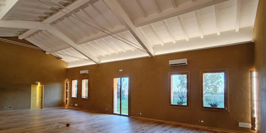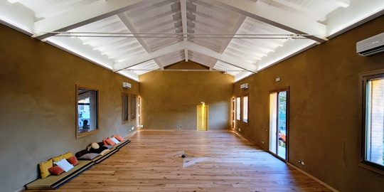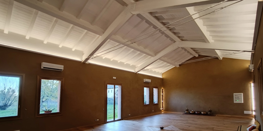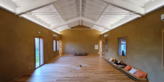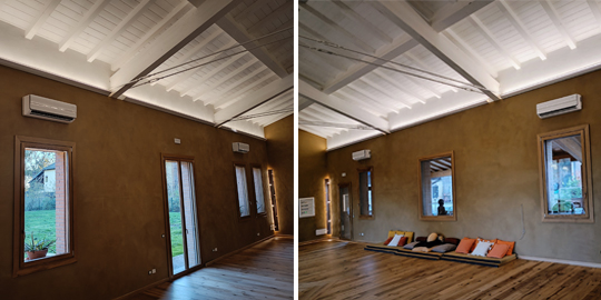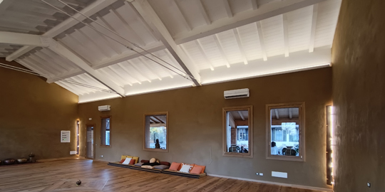 Per creare la giusta atmosfera, ha installato sulle pareti le lampade Slim Applique di Adriana Lohmann. Le Slim, qui personalizzate nella lunghezza di 5mt ognuna, si fondono con lo spazio e, grazie alla luce dimmerabile, creano l’ambiente corretto per stimolare calma e pace durante gli esercizi del centro.